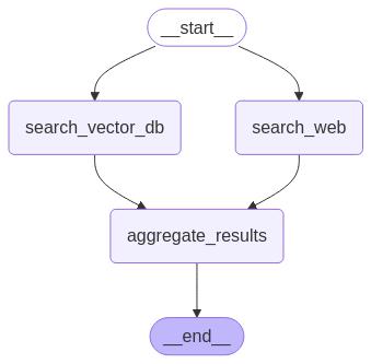 The key difference is simple yet transformative, both search_web and search_vector_db nodes initiate concurrently from the same start point. With minimal effort, your application now handles tasks far more efficiently, significantly enhancing user experience.