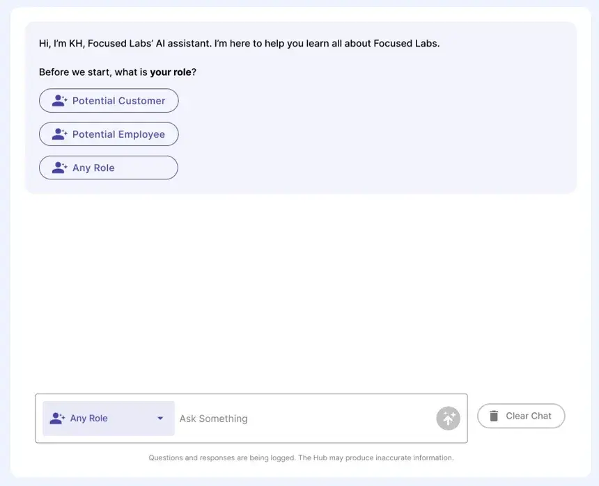 For the knowledge hub, we don’t want the user to need to know anything about Focused Labs before using the tool. Instead, we want programmatic prompt engineering, or what I like to call “prompt expansion”.